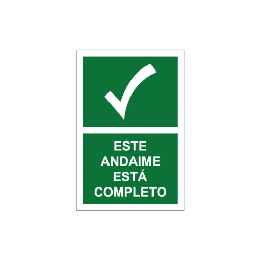 Sinalética / Pictograma ESTE ANDAIME ESTÁ COMPLETO ESTALEIRO – ES7054A apresentado nas opções de vinil autocolante e PVC.