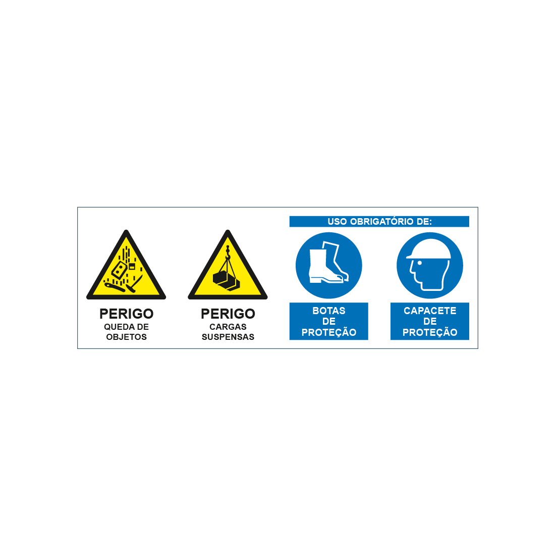 Sinalética / Pictograma PERIGO QUEDA OBJECTOS CARGAS SUSPENSAS OBRIGATÓRIO BOTAS E CAPACETE PROTEÇÃO – ES7047 apresentado nas opções de vinil autocolante e PVC.