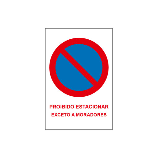 Sinalética / Pictograma ESTACIONAMENTO PROIBIDO PROIBIDO ESTACIONAR EXCEPTO MORADORES – PQ7337 apresentado nas opções de vinil autocolante e PVC.