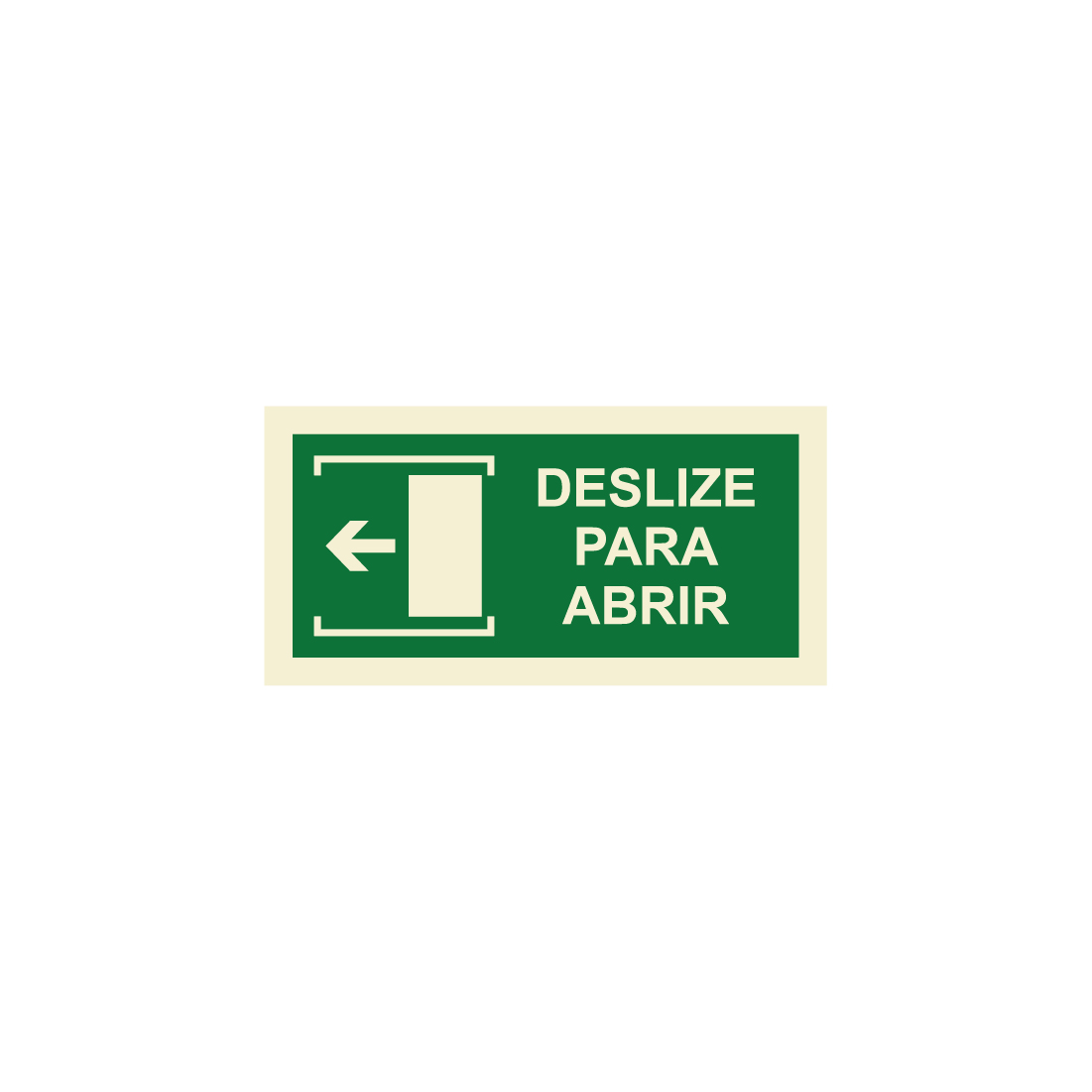 Sinalética / Pictograma PORTA EMERGÊNCIA DESLIZE ABRIR ESQUERDA – EM2090 apresentado nas opções de vinil autocolante e PVC.