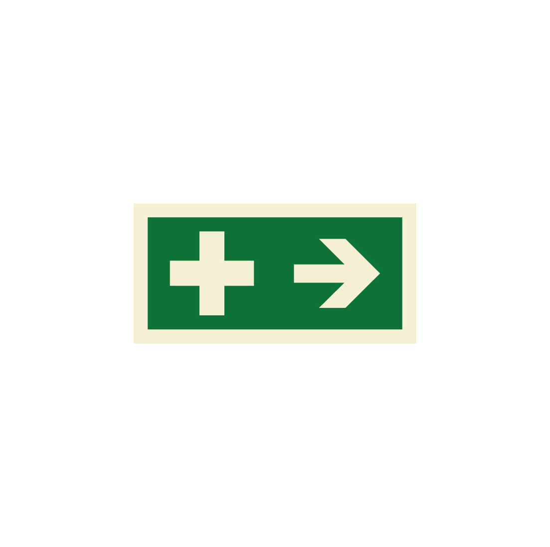 Sinalética / Pictograma PRIMEIROS SOCORROS AUXÍLIOS SETA ESQUERDA DIREITA FRENTE – EM2116 apresentado nas opções de vinil autocolante e PVC.