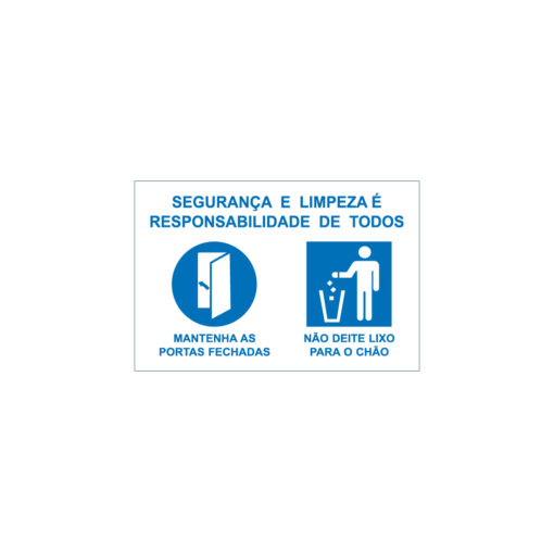 Sinalética / Pictograma SEGURANCA E LIMPEZA E RESPONSABILIDADE DE TODOS MANTENHA AS PORTAS FECHADAS NAO DEITE LIXO PARA O CHAO – PD7172 apresentado nas opções de vinil autocolante e PVC.