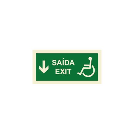 Sinalética / Pictograma SETA SAÍDA DEFICIENTES BAIXO – EM2084 apresentado nas opções de vinil autocolante e PVC.